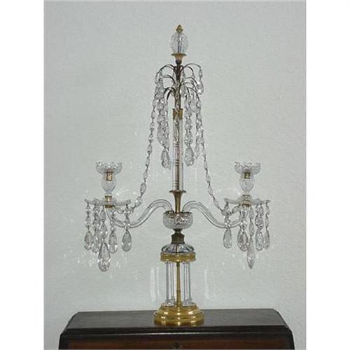 A regency cut glass and gilt metal two light candelabra. Circa 1810, 29" tall, 18 1/2" wide, hung with prisms, with two scrolled candle branches. A beautiful antique piece, the pear shape prisms add elegance to this very interesting piece. Condition is good there is a large chip to the central cut glass column as shown but the column can be turned to the back and there are some minor chips to some of the prisms.