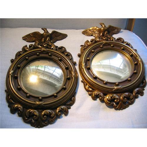 pair of nice vintage convex mirror is gilded and are very decorative.made of composite. convex with eagle finial and in original condition. nice accessory for a nice home. they are English Regency Style with Eagle Crest ball mounted frame. is in very good condition, normal wear and tear (tiny spots on the mirror),ebonized inner.