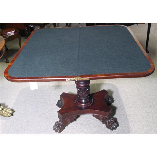 English Regency Mahogany Games Table with carved 'paw' feet and acanthus leaf pedestal.