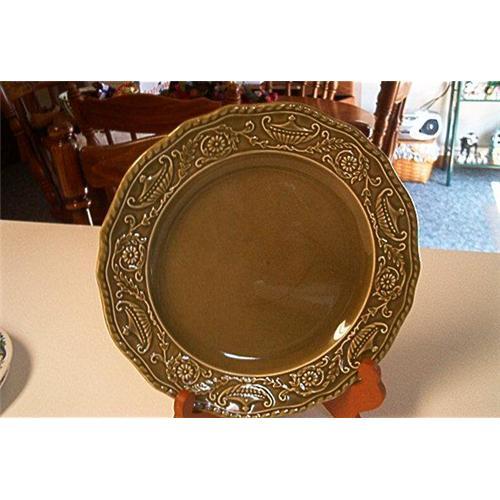 This plate is dark green or olive green. It has scalloped edges and decorated on the outside rim with what appears to be aladdin lamps and leaves. Bottom of the plate is stamped with: Regency Ironstone; Cannonsburg Pottery Co.; USA; 1988. 3 small chips on the bottom edge and a hairline crack on the top center. The plate measures: 10 1/8 inches wide.