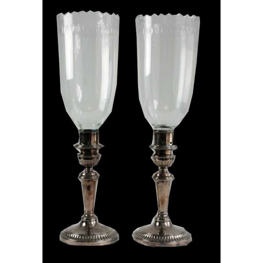 Regency style hand-chased hurricane lamps, with etched crystl shades, mounted on weighted candlesticks. Marked: I.F.S. Ltd ( Israel Freeman & Sons, Sheffield England ) 21" H X 5 3/4" W.