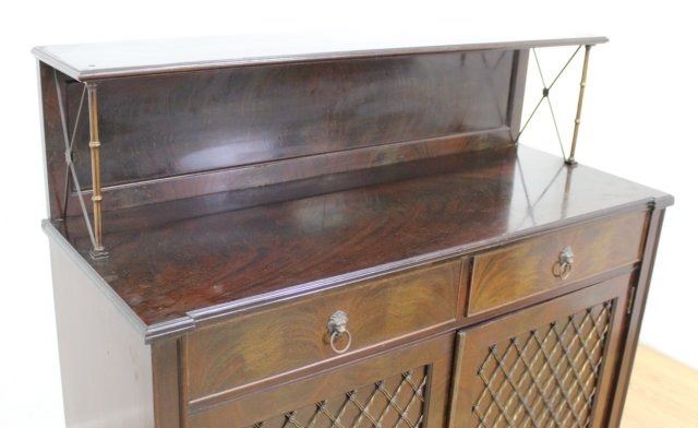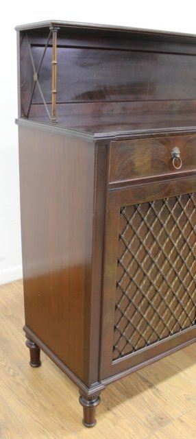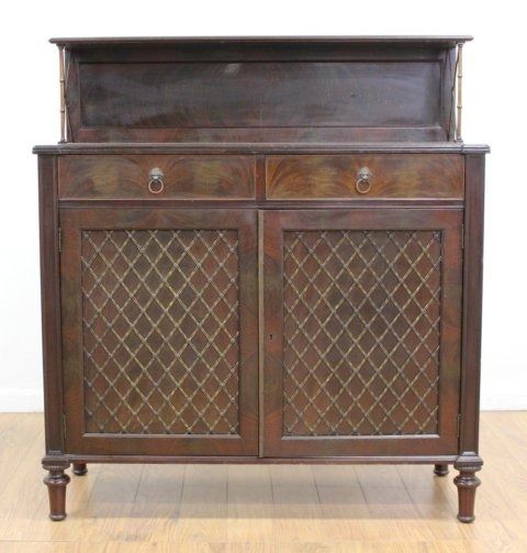 Circa 1940. 2 drawers over 2 doors with brass grilles. Approx. 50" H x 44" x 17".