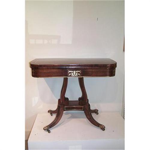 A beautiful Regency rosewood card table with brass inlay. 36" x 17 3/4" closed.