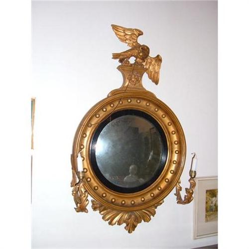 A Regency girandole looking glass with convex mirror. Eagle is perched on top of the mirror with a lion's head below. Wonderfully carved candle arms with ball ornaments. We are happy to supply additional photos upon request.