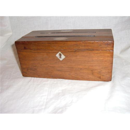 A lovely Regency or early Victorian letter box of rosewood with oval shaped mother of pearl inlay reading, "Answered," and "Unanswered." There is a letter slot for each. The interior of the box is lined with a green, white and gold paper with a removable divider in the middle. The divider is also lined with the same paper. There is a mother of pearl escutcheon with a working key. Minor age cracks on the top of the box.