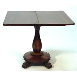 Regency rosewood tea table, the folding top above a frieze with a pair of rose carved roundels, supported by a faceted bulbous column on circular platform with hairy paw feet
