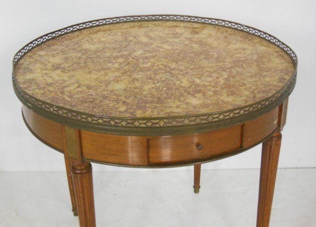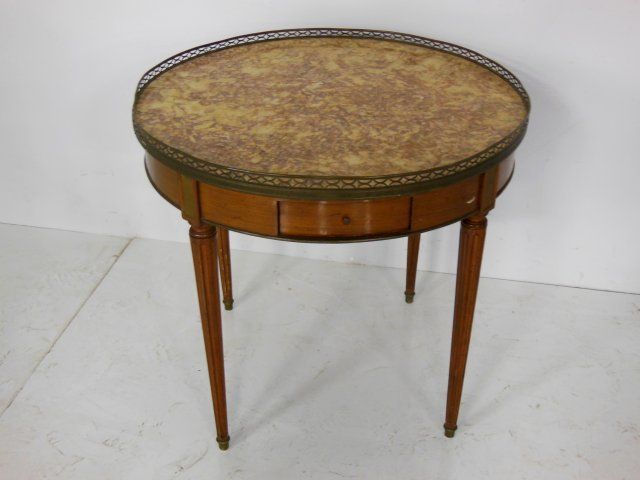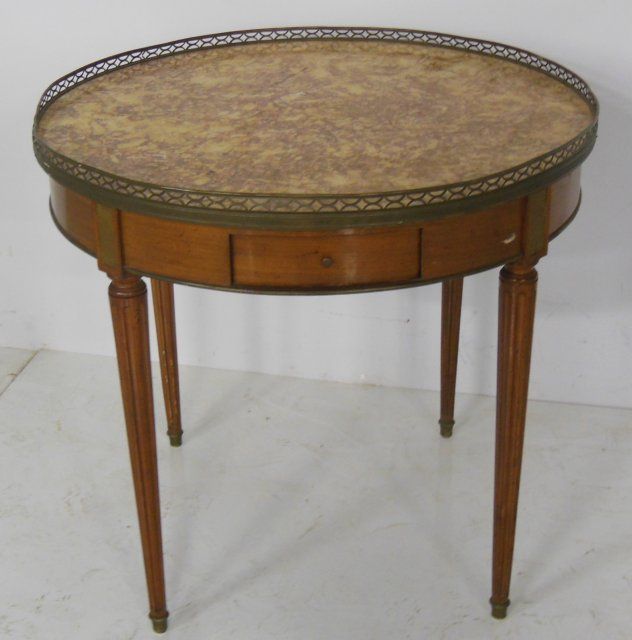 Bronze mounted, marble top, pierced gallery. Approx. 28" H x 29.5" Diam.