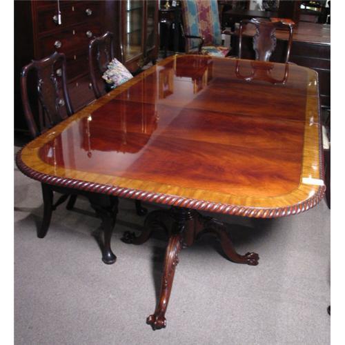 Imported English made twin pedestal mahogany & satinwood dining table with gadrooning around edge (rope effect). Has two leaves each 2lins x 47ins. Size with leaves 120ins long x 47ins wide x 30ins high. Photos shown are with l leaf in. The pedestals are beautifully carved with acanthus leaf theme and ball and claw. This is a great buy. The table is sturdy, exceptionally well made and has a gloss finish. Seats 10 fully extended.