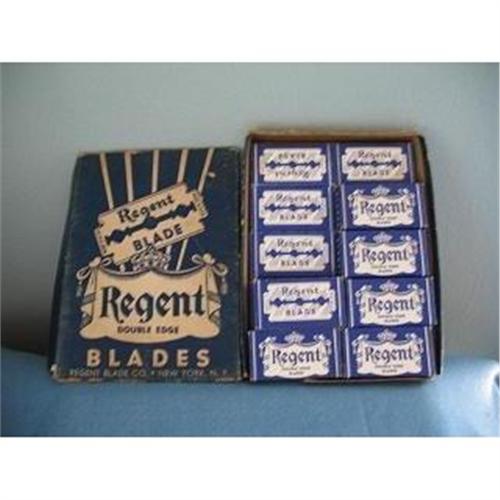 This vintage box containing 16 packages with 5 blades per pack were made in the U.S.A by regent Blade Company. Each pack made of surgical steel are all in new un-opened condition, the box has age wear as I have shown in my pictures and they measure 1 inch by 2 inches. The box itself is marked: Regent Blade/Every Blade Guaranteed/ More Shaves Per Blade/Made in USA while the package of blades are marked: Regent Blade Company/New York, N.Y. A wonderful addition to any Pharmacy or Vintage Shaving Collection. <BR>SH & Ins. will be quoted after orders placed. If you have questions please contact me and thank you for looking.