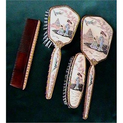 This four piece vanity set, with an Oriental motif, was produced, during the 1930s, in England by REGENT OF LONDON. Hand painted on silk Oriental ladies, in kimonos, Cherry Blossom tress, Empress birds, Pagodas, Coy fish and more adorn the backs of the 12 1/2 x 4 1/2 inch beveled mirror, the 9 1/2 x 3 1/2 inch hair brush and the 5 1/2 x 2 inch clothes brush - the comb is encased in an ornate brass holder. Both the brushes are on spring clips and can be easily be detached from frame for ease of cleaning. The brushes are marked: Regent of London Made in England - Nylon. The large hair brush also has a number on the back of the brush which reads - F.740 and the smaller brush reads - C.F.635. The hand painted detail on the silk and the reverse hand painting on the high quality clear overlay creates an astounding 3 Dimensional effect that must be seen to be appreciated, as my photographic skills cannot begin to show the intricate designs properly. The heavy brass casings display a similar attention to quality and detail. All four pieces are in excellent condition.