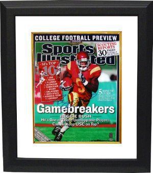 In 2003, Reggie Bush was a consensus First-team Freshman All-American selection and became the first Trojan since Anthony Davis in 1974 to lead the Pac-10 in kickoff returns. His 1,331 all-purpose yards set a USC freshman record. In 2005 Bush was a unanimous First-team All-American and winner of the Heisman Trophy. He was also named the Associated Press College Football Player of the Year, Pigskin Club of Washington D.C. Offensive Player of the Year, and Touchdown Club of Columbus Player of the Year. Bush also won the Walter Camp Award and the Doak Walker Award; which is given to the nation's best running back. Reggie Bush has hand autographed this USC Trojans Sports Illustrated 16x20 Photo. White Mat and Black Color Framed as shown. Bush hologram and Certificate of Authenticity from Athlon Sports.