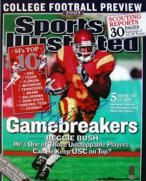 In 2003, Reggie Bush was a consensus First-team Freshman All-American selection and became the first Trojan since Anthony Davis in 1974 to lead the Pac-10 in kickoff returns. His 1,331 all-purpose yards set a USC freshman record. In 2005 Bush was a unanimous First-team All-American and winner of the Heisman Trophy. He was also named the Associated Press College Football Player of the Year, Pigskin Club of Washington D.C. Offensive Player of the Year, and Touchdown Club of Columbus Player of the Year. Bush also won the Walter Camp Award and the Doak Walker Award; which is given to the nation's best running back. Reggie Bush has hand autographed this USC Trojans Sports Illustrated 16x20 Photo. Bush hologram and Certificate of Authenticity from Athlon Sports.