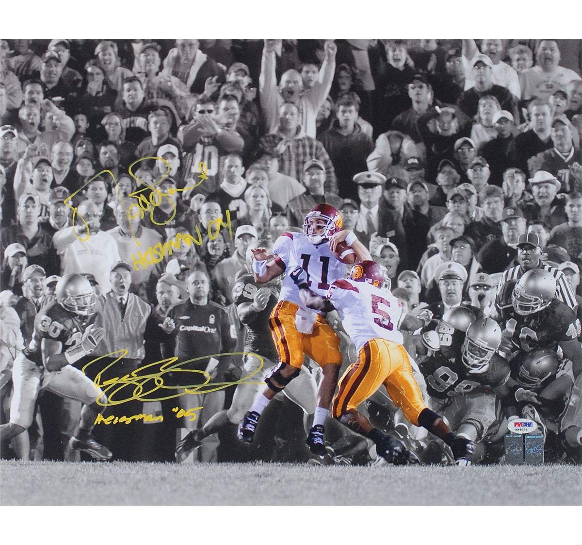 Color satin-finish 20 x 16 photo of the infamous ‘Bush Push’ against Notre Dame, signed in yellow ink, “Matt Leinart Heisman 04,” and “Reggie Bush Heisman 05.” In fine condition, with a PSA/DNA authentication label affixed to lower corner. Accompanied by a certificate of authenticity from PSA/DNA.