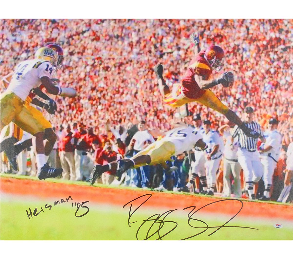 Enormous color 29 x 22 print on stretched canvas of Bush hurdling a defender while at USC, signed in black felt tip, “Reggie Bush, Heisman ’05.” In fine condition, with a slightly grainy quality to the image and a PSA/DNA label affixed to the lower right (certificate of authenticity not present).