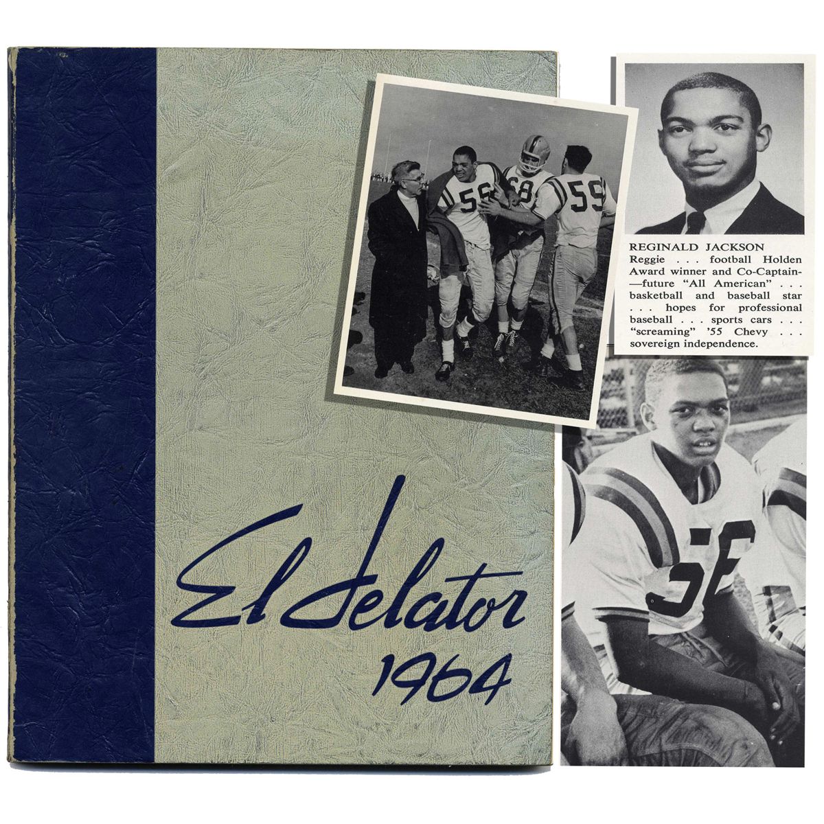 Reggie Jackson 12th grade high school yearbook, including four photographs of Jackson in his sports uniforms, with two ''in-game'' football photos. Also includes a 1.75'' x 2'' senior portrait, labeled ''Reginald Jackson'', followed by a short statement from Jackson reading, ''Reggie...football Holden Award winner and Co-Captain -- future 'All-American'...basketball and baseball star...hopes for professional baseball...sports cars...'screaming' '55 Chevy…sovereign independence.'' Yearbook measures 8.5'' x 11''. Near fine condition.