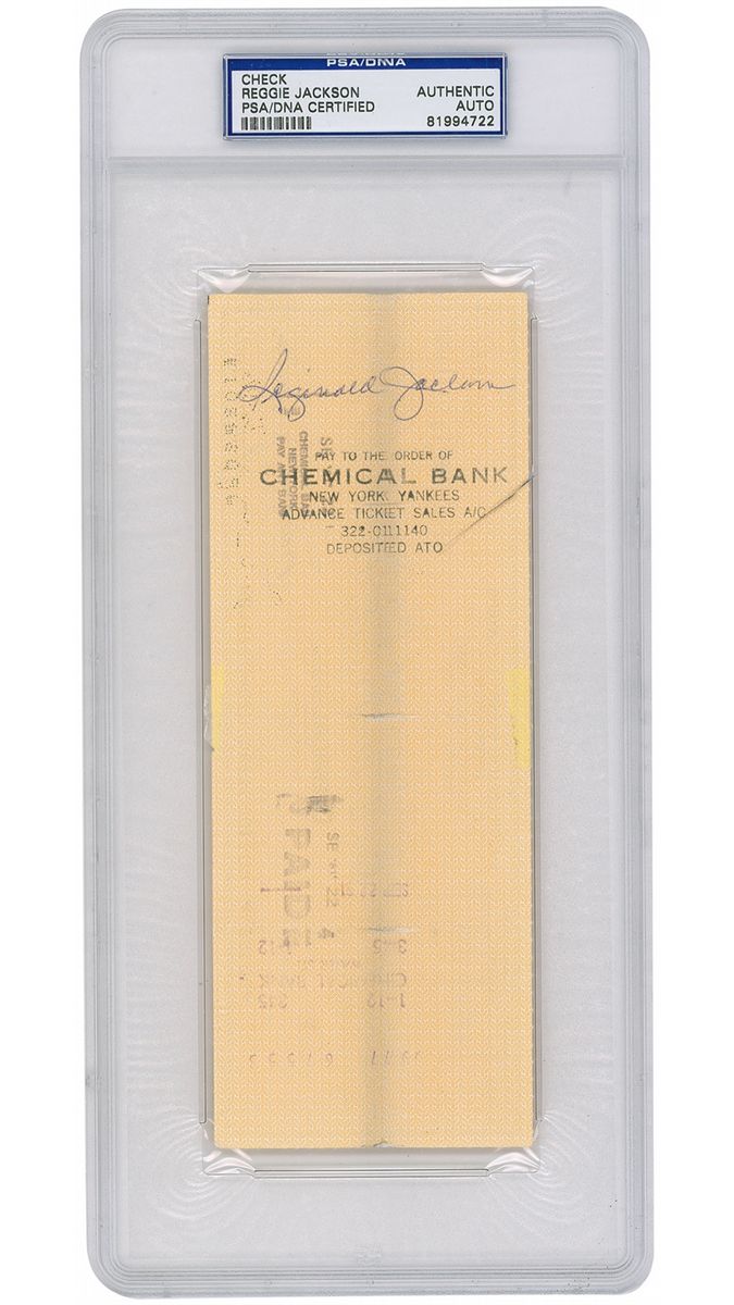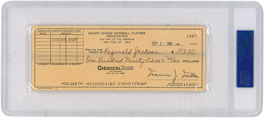Endorsed Major League Baseball Players Association business check, 8.25 x 3, filled out and signed in another hand, endorsed on the reverse by Jackson, “Reginald Jackson,” payable to Reginald Jackson for $193.00, stamp-dated September 1, 1981. Encapsulated in a plastic PSA/DNA authentication holder. In fine condition, with several vertical folds and light bank stamps to reverse, one lightly touching beginning of signature.