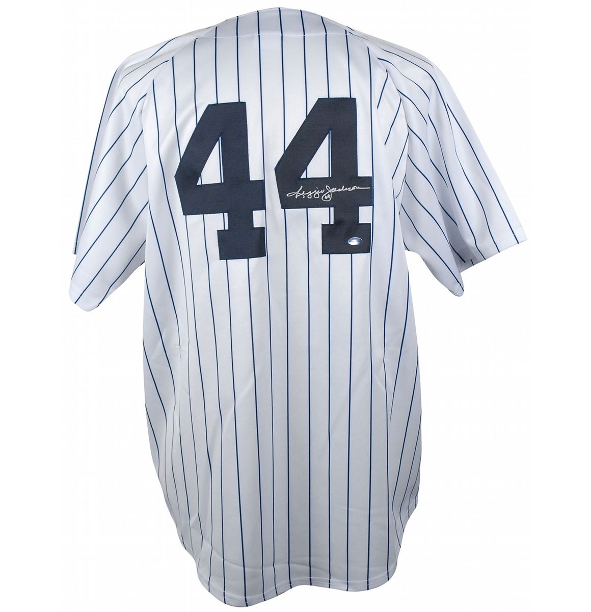 Official Majestic replica New York Yankees baseball jersey, with sewn on letters and numbers, signed in silver ink on the number on the back, “Reggie Jackson, 44.” In fine condition.
