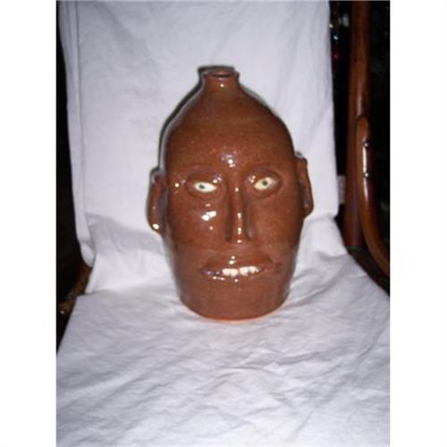 Whenever I would go to visit my son in Florida,I would buy southern pottery along the way.I am running out of room so have decided to list a few pieces I have.This is a wonderful Face jug by Reggie Meaders.It is incised on the side behind the left ear.Reggie Meaders is the son of Cheever & Arie Meaders of Cleveland (Mossy Creek),Georgia.He comes from a long line of well known Folk Pottery Potters.I may live in Wisconsin but I love this very artful,wonderful Folk Art.As most of the Southern pottery the teeth are made from pieces of rock,etc. and the eyes are also made seperate.No chips or cracks in this piece.Stands a good 10 1/2" tall.