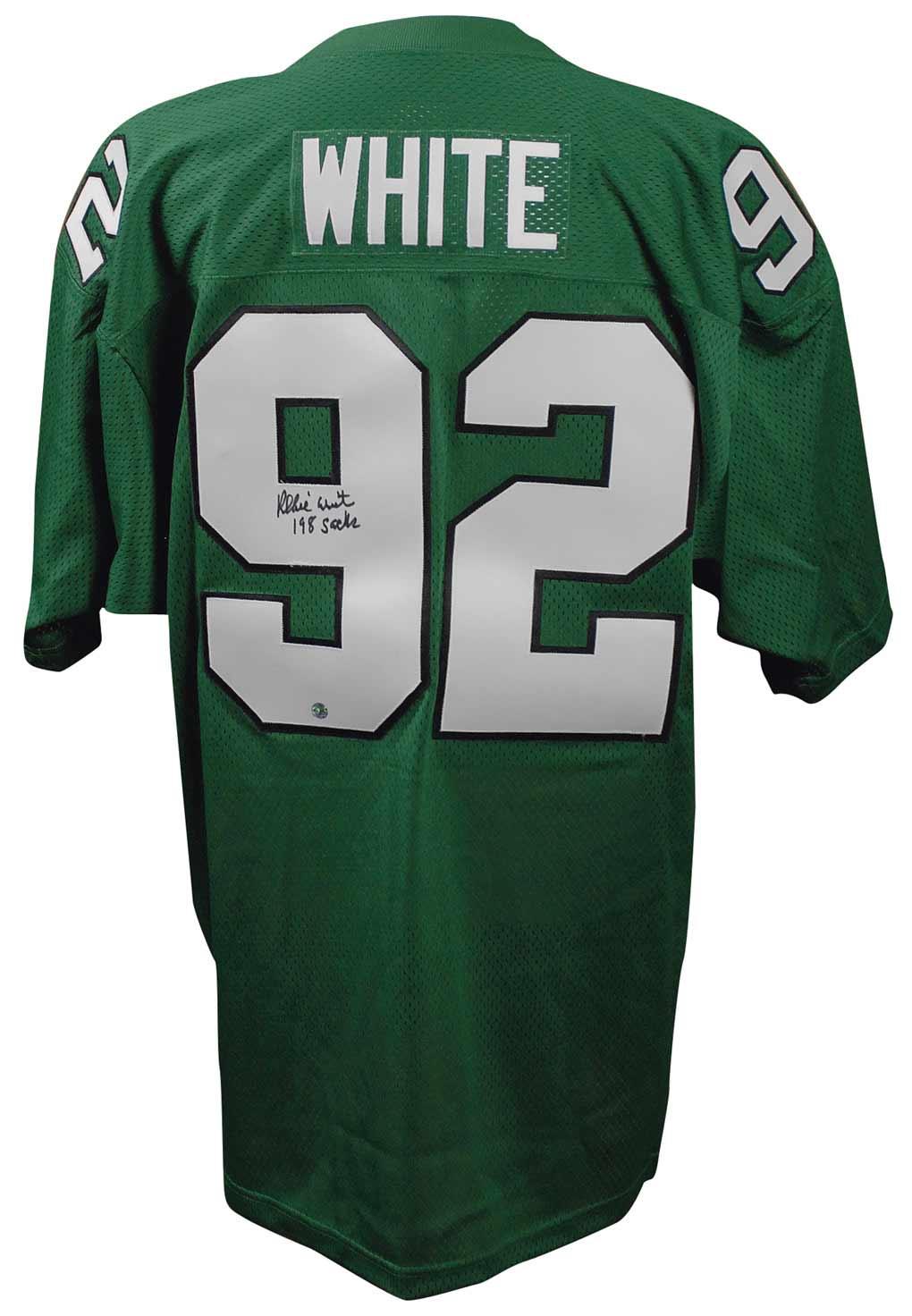 Replica Philadelphia Eagles football jersey, with sewn on letters and numbers, signed in black felt tip on the number on the back, “Reggie White 198 sacks.” In very fine condition.