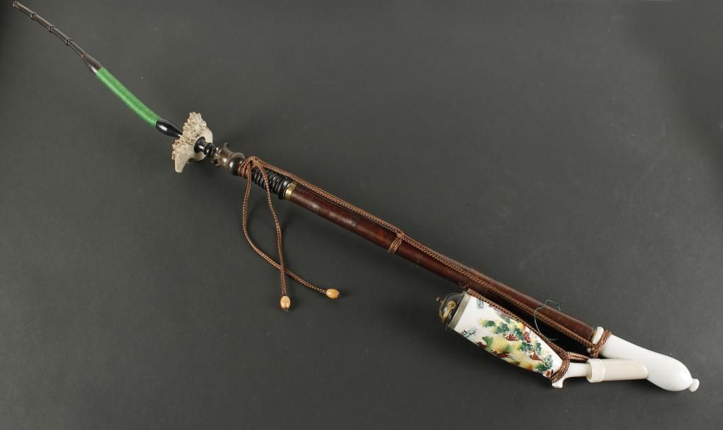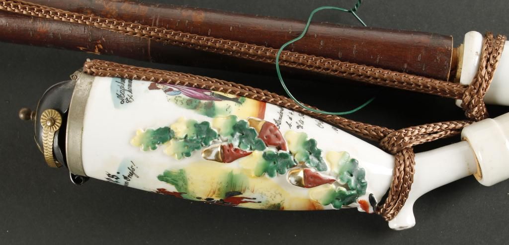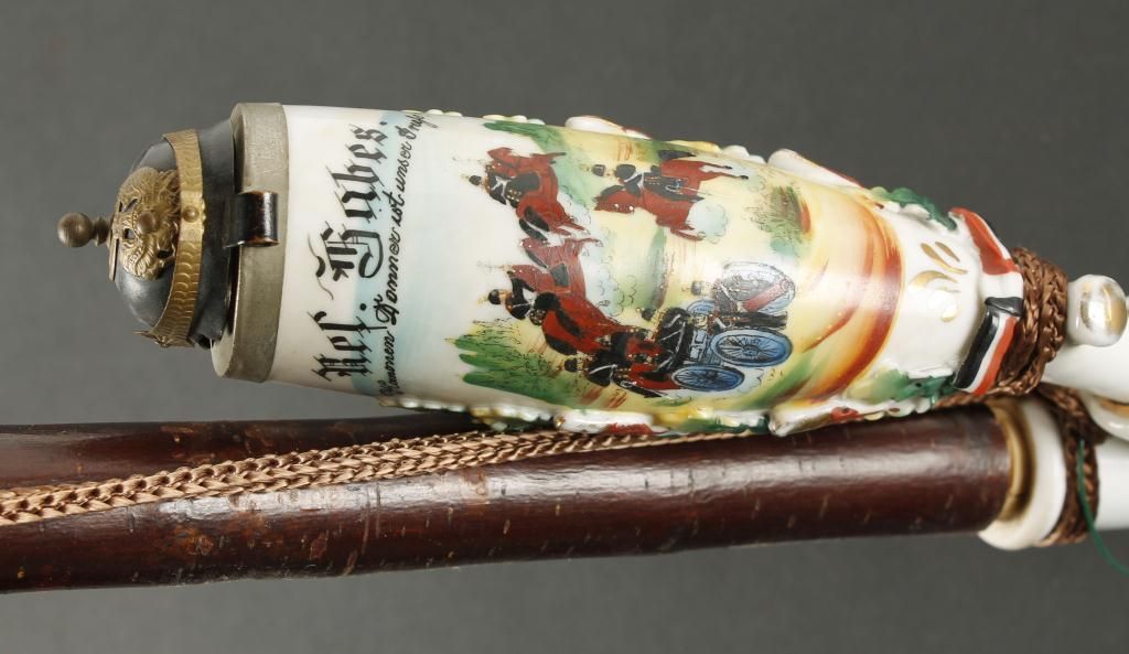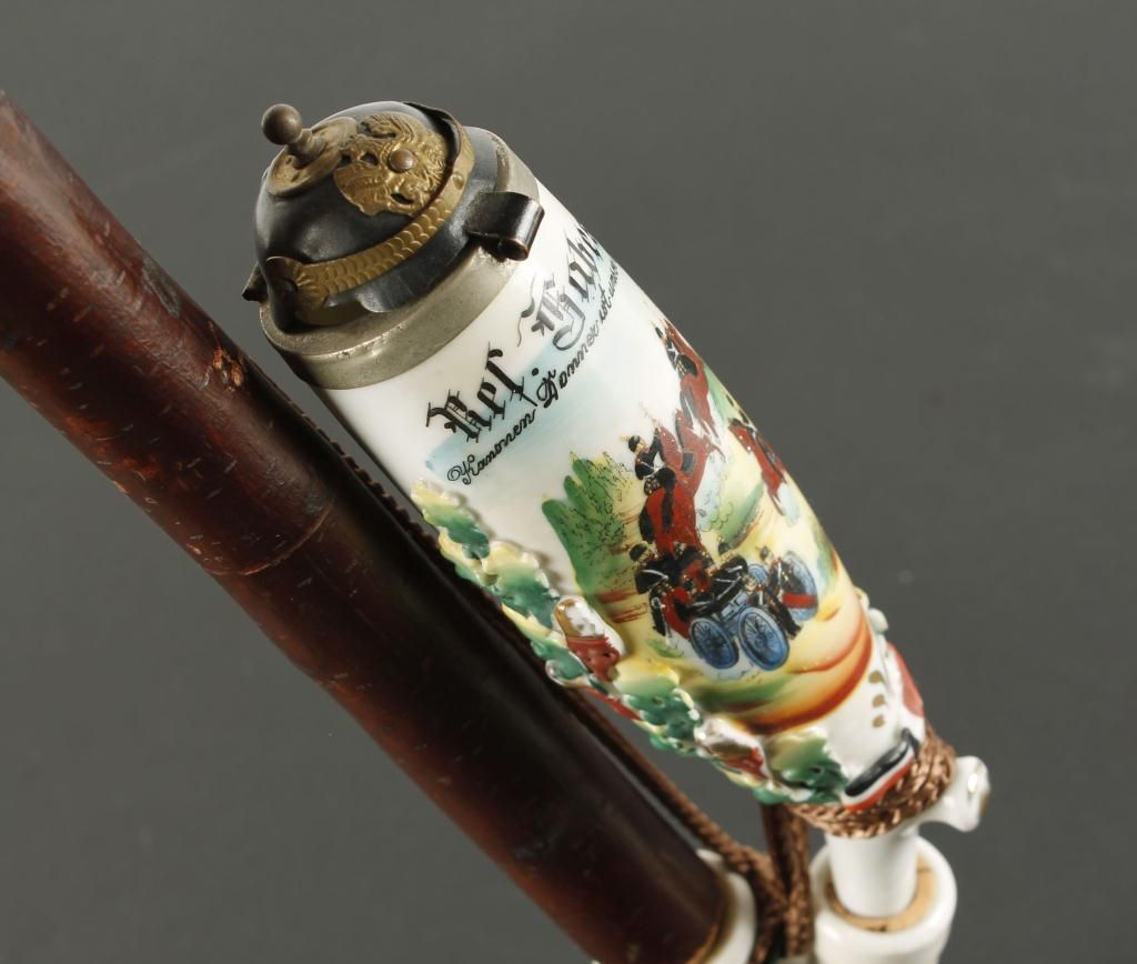 Front shows scene of horsemen and artillery and name "Rel Gabes", 1905-1907 date and inscription on back, white porcelain, helmet lid, wood and horn molded stem, slight wear to scene, very good condition.