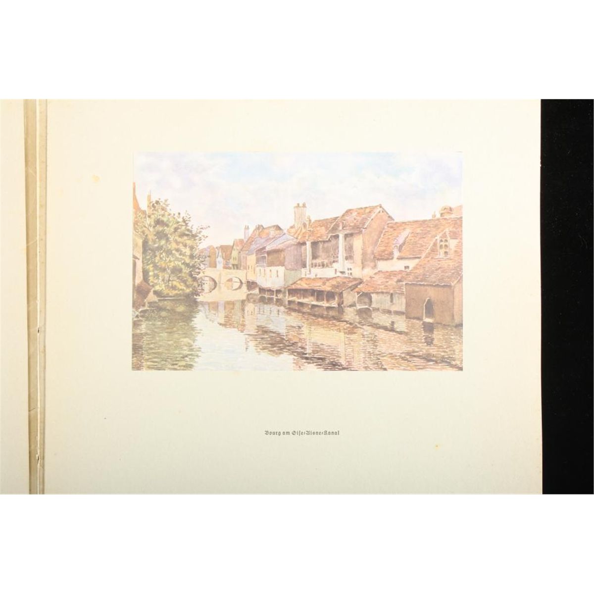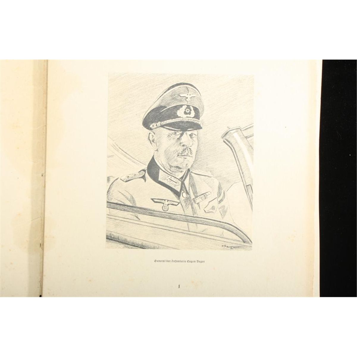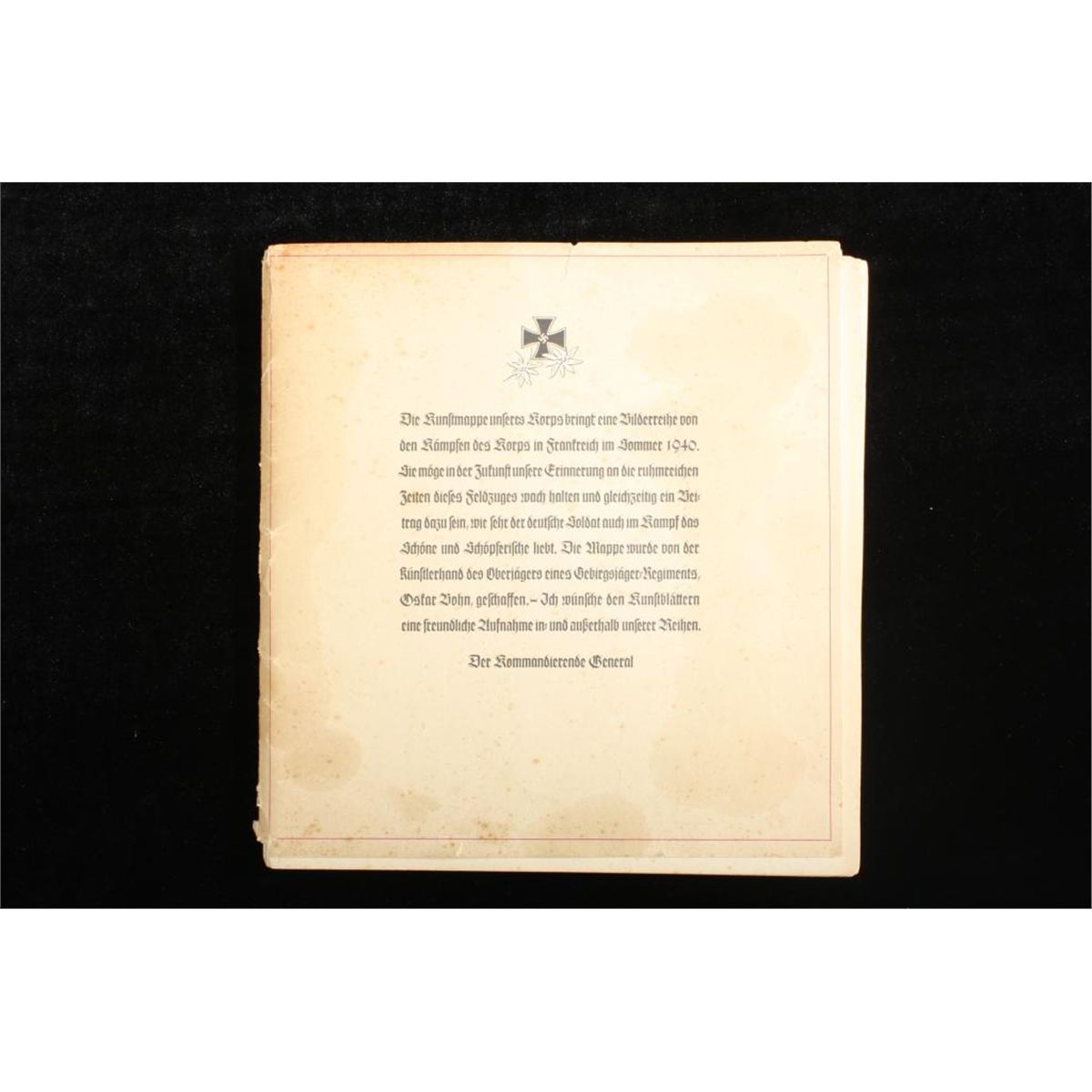 Regimental history for Summer of 1940 showing Iron Cross and edelweiss insignia at top, showing 19 prints laid on paper numbered 1-19 beginning with portrait of general Eugen Deyer, General Ritter Von Sped, UnferCommander General, The Chief of the General Staff, shows cyclists, tank battle, infantrymen, aerial attacks, street battle, a black man in the regiment, portraits of towns, cathedral, Chateau LeMat Tilly, Glen,Nordweffen, countryside, tunnel, mountains. Shows some staining and deterioration. Artwork is generally good overall. Est: $400 - $800