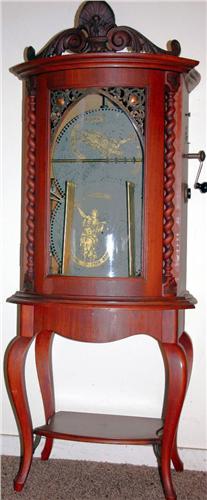 Regina 15 ½" Disc Bow Front Changer Musical Box. Nice mahogany cabinet. Changing mechanism works well. Sound is excellent. Has cords to lift records rather than bands.