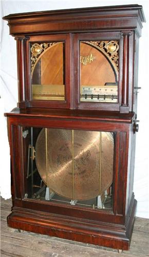 Regina 27" Disc Automatic Changer Music Box coin-operated. Holds 12 discs from which to choose your tune. Changing mechanism works well and the sound is very pleasant. Nice original mahogany wood..