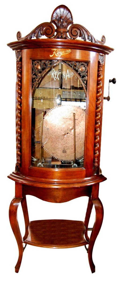 Beautiful Regina Disc Console Player on base., walnut. A gorgeous player that sounds great. Would liven up any room. Comes with 10 - 15 1/2 inch discs. Excellent Working condition. 69 inches tall.