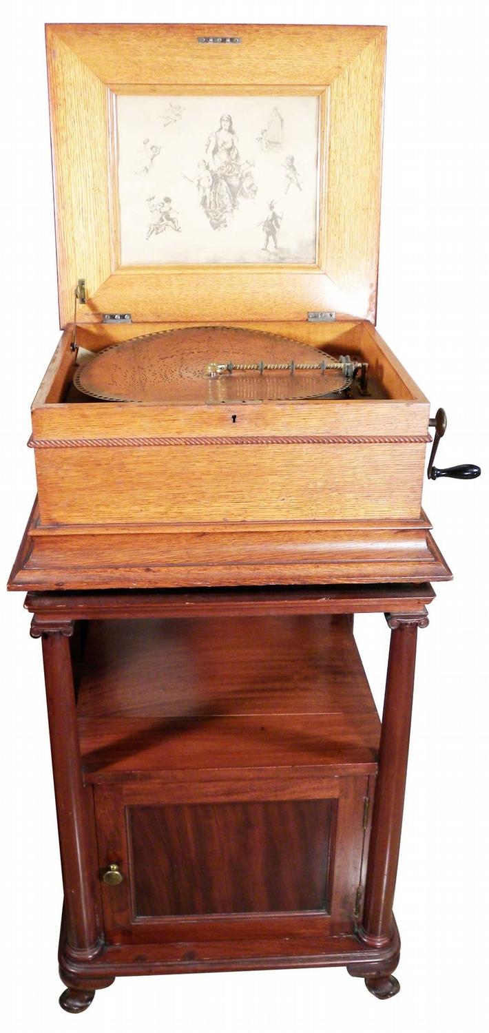 Regina Disc Player, double comb 15 1/2 inch disc. Table top with original oak case. Original paper lid insert. Comes with 5 discs. Excellent all original condition. 22 1/2 X 9 1/2 X 20 inches closed.