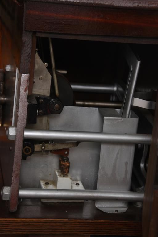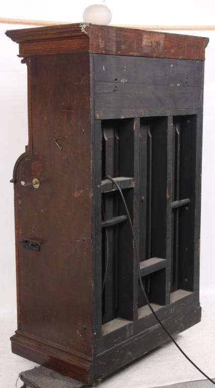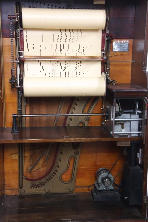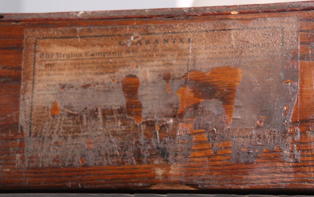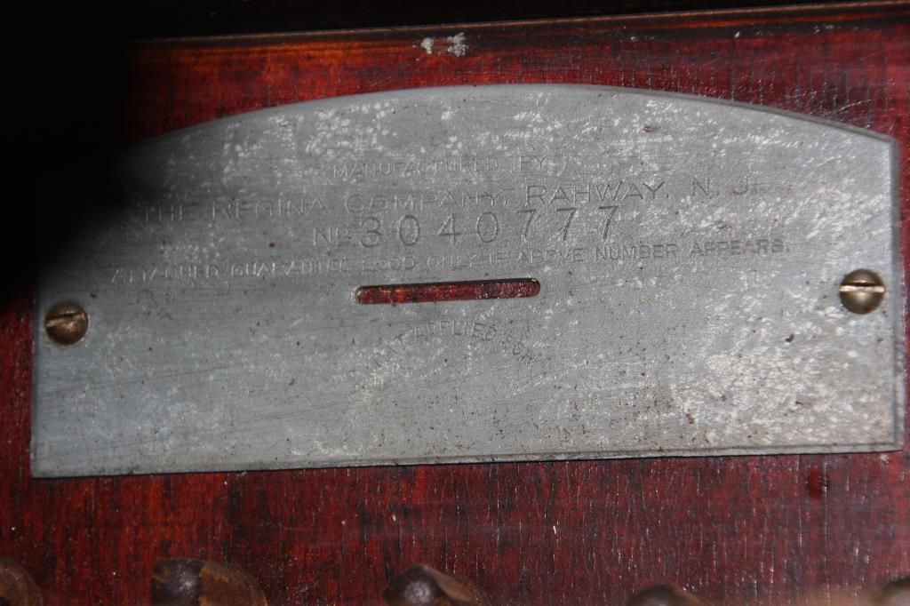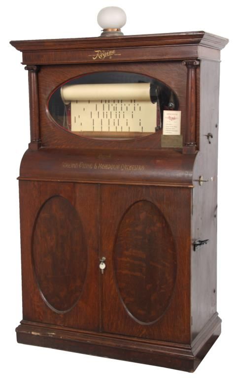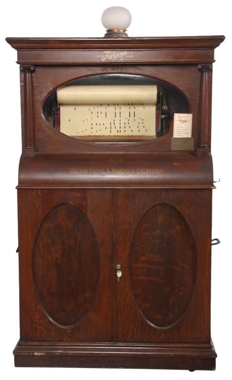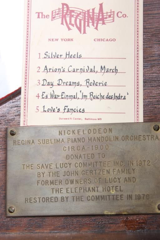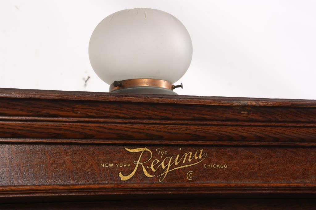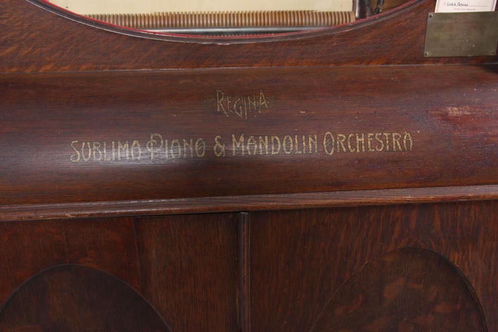 Regina Sublima Piano Mandolin Orchestra Style 304. The Regina Sublima plays from large manila paper rolls measuring 19.5 in. long and each containing 5 tunes; the upright piano harp is mounted onto the backboard and sounds like a mandolin when playing. 25 cent coin operated machine has coin slot on the right side; oak case has a beveled glass oval panel on the front viewing the top reel of the paper roll and has 2 lower doors with inset oval panels, has a single light mounted on top with frosted and cut glass globe, gold Regina decal at the frieze of the case and below the oval glass has gilt lettering which reads “Regina, Sublima Piano & Mandolin Orchestra”. Signed in the back of the case on a nickel tag The Regina Company with serial number 3040777. Also has a presentation plaque on the front stating that the Sublima was given to the Lucy & Elephant Hotel in Margate City, NJ and that it was restored by “The Committee” in 1976; also signed with a paper label on the back of the case. In good working condition and has 3 extra rolls. 64 in. high x 41 in. wide x 19 in. deep