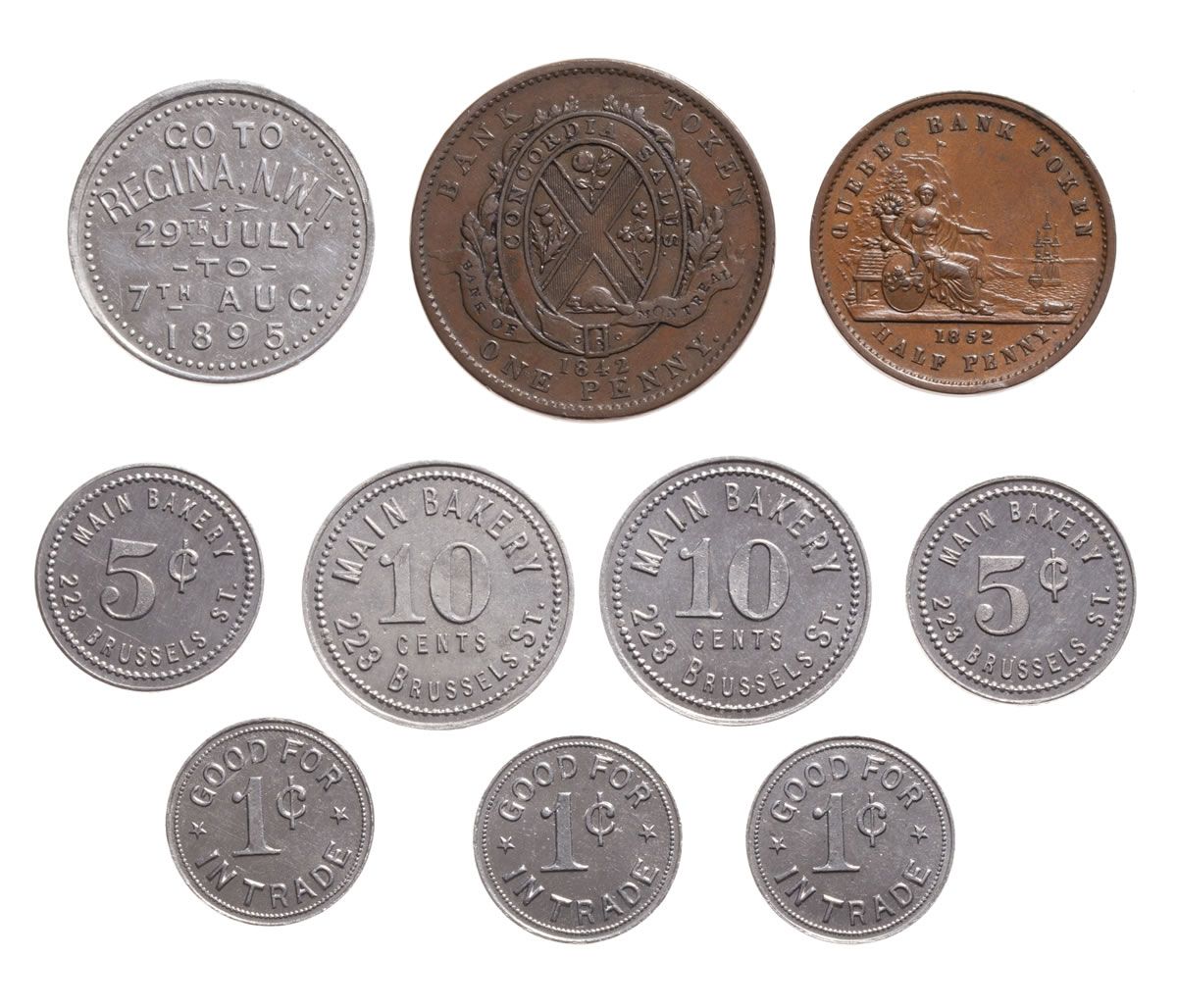 N.W.T., Exhibition medallion, 29th July to 7th Aug., 1895, Dominion Coat of Arms on reverse, Wm, 29mm, EF; W.J. Dobbin & Co., Dept. Store, Elbow, SK, Good for 1¢, Al, (3), EF; Main Bakery, St. John, NB, Good for 5¢ (2); 10¢ (2); VF to EF; Pre-Confederatio