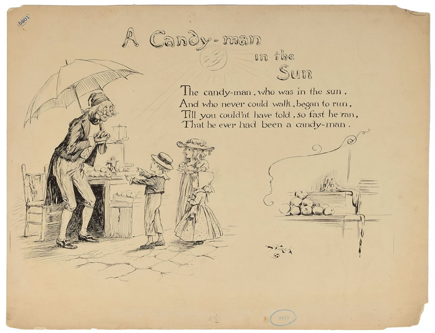 English-American artist and illustrator (1856–1943) best known for his depiction of the titular hero of Frances Hodgson Burnett's 1886 novel Little Lord Fauntleroy. Detailed original comic artwork by Reginald Birch, accomplished in graphite and ink on an off-white 21 x 18 sheet of artist’s cardstock, signed in the lower right, "Birch." The comic, entitled "A Candy-man in the Sun," depicts a trio of children, the boy clad in a Little Lord Fauntleroy suit, wanting to purchase a small candy-man from an elderly confectionary vendor, with a smiling sun casting its rays upon the man's table of sweets. The adjacent sketch shows the same vendor table from a closer perspective, and the candy-man now melted down to a weeping head. The above poem tells the story: "The candy-man, who was in the sun, / And who never could walk, began to run, / Till you couldn't have told, so fast he ran, / That he ever had been a candy-man." Reverse bears editorial notes in pencil, adding the title, "The Candy Man," and date, "Nov. 94." In fine condition, with chipping to the edges and light soiling.
