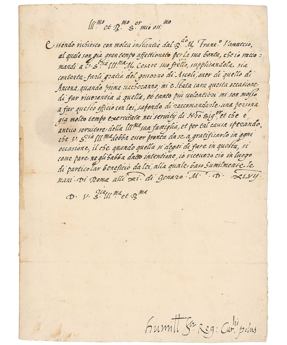 English cardinal of the Catholic Church (1500–1558) and the last papal Archbishop of Canterbury. Very rare LS in Italian, one page, 8.5 x 11.25, Rome, January 21, 1557. Letter to Cardinal Santangelo demanding that Francesco Vannuccio be named governor of