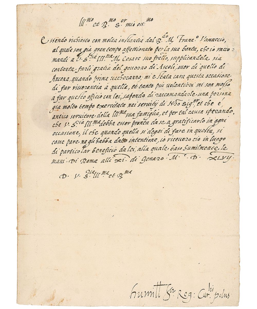 English cardinal of the Catholic Church (1500–1558) and the last papal Archbishop of Canterbury. Very rare LS in Italian, one page, 8.5 x 11.25, Rome, January 21, 1557. Letter to Cardinal Santangelo demanding that Francesco Vannuccio be named governor of Ascoli instead of Ancona, and praising his qualities, among which his having well served the family of his correspondent. Reverse of second integral page bears two docketing notations and wax seal remnant. Intersecting folds, some scattered light creasing and toning, and reinforcement along hinge, otherwise fine condition. While in Rome in the early 1530s, Pole resisted his cousin Henry VIII’s pressure to validate his divorce with Catherine of Aragon. When the incensed king had his brother and mother imprisoned and later executed in 1536, Pole again defied him, causing Henry to unsuccessfully plot the murder of his cousin in Italy. Twenty years later, under Henry’s daughter Mary’s reign, Pole was made Archbishop of Canterbury, and it is in this position that he signed this letter, less than two years before his own death.