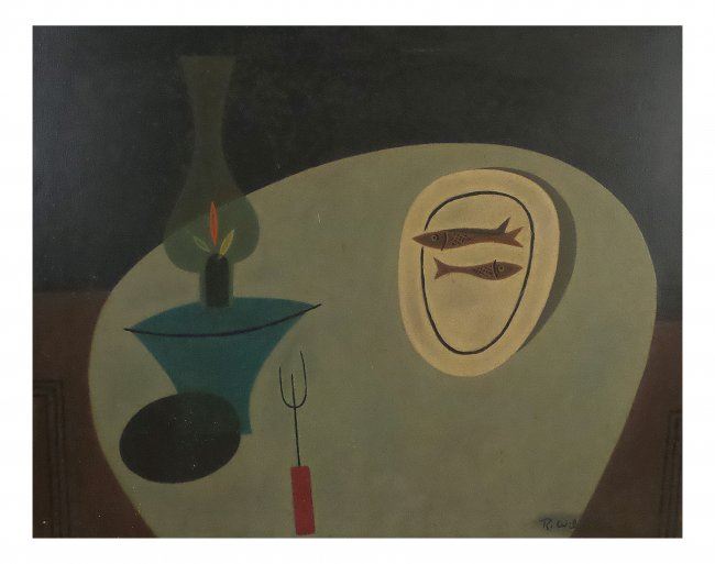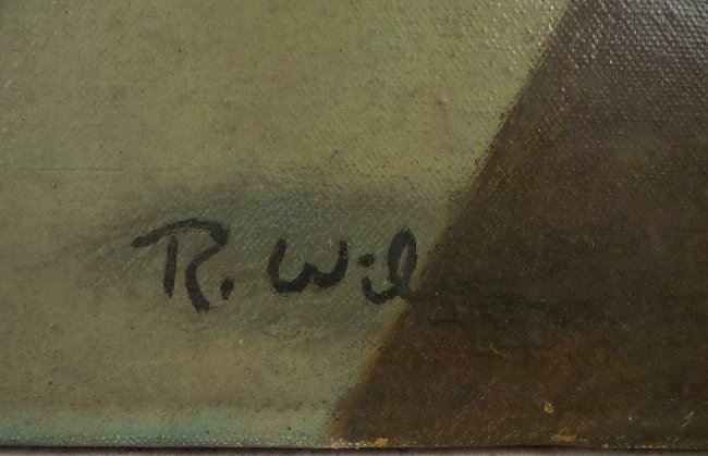 Oil on canvas. Unframed modern still life titled, "Lamp". Signed lower right, "R. Wilson". Signed and titled on stretcher, along with various inventory markings. [Art: 24" x 30"]. Unframed, soiling, scuffs. Some wear at edges.