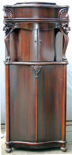 Reginaphone Music Box #240 plays 15 ½" discs. Carved mahogany case has lion heads on front corners and inside horns. Reginaphone lettering on inside of lid. Cabinet has beautiful hand finish. Mechanism has dual combs and short bed plate with zither attachment.