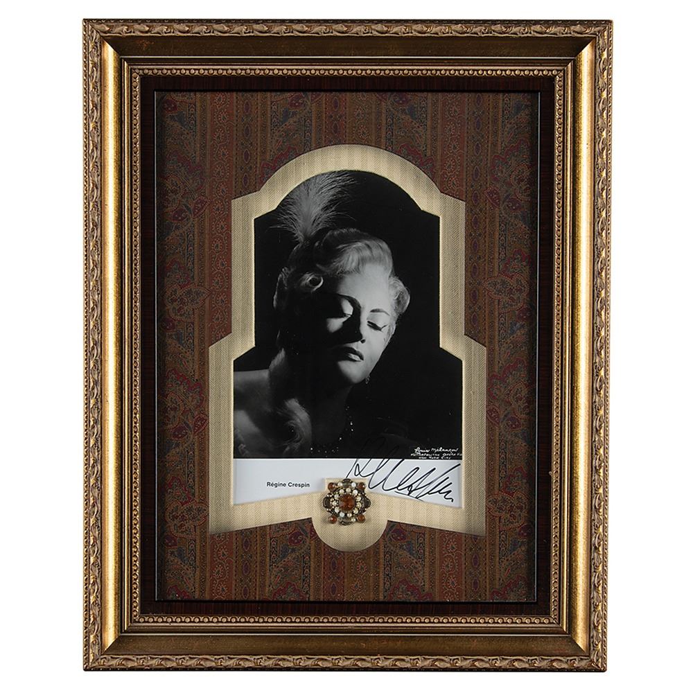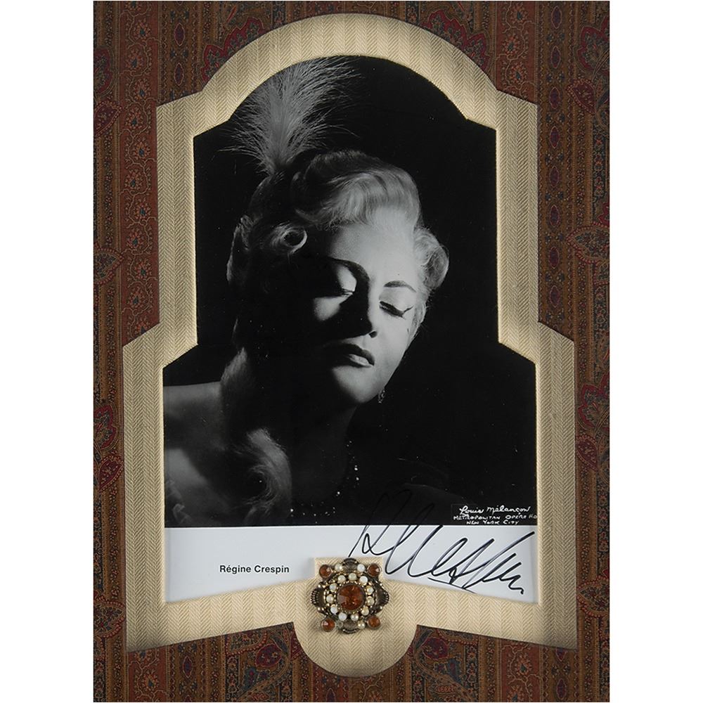 Glossy 6.5 x 9.25 promo photo of Regine Crespin, signed in the lower border in black felt tip. Ornately matted and framed with an appealing brooch attributed to Crespin's personal collection to an overall size of 14.75 x 18.25. In fine condition. Provenance: Anna Sosenko, an impresario who had a well-known autograph boutique in NYC in the 1980s.