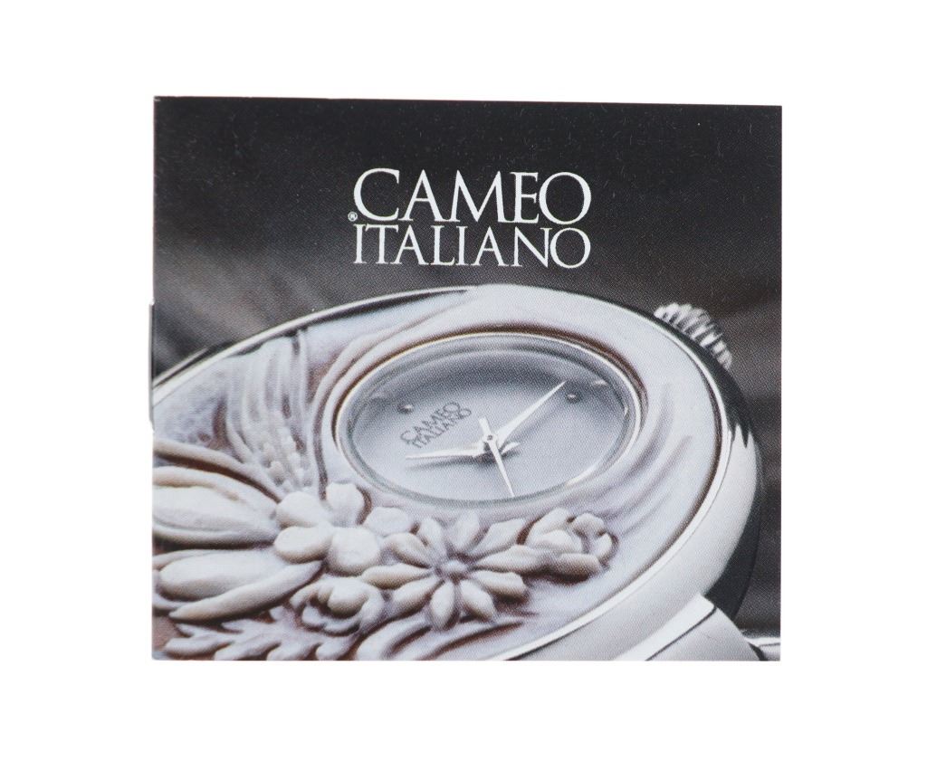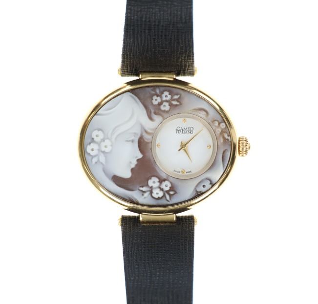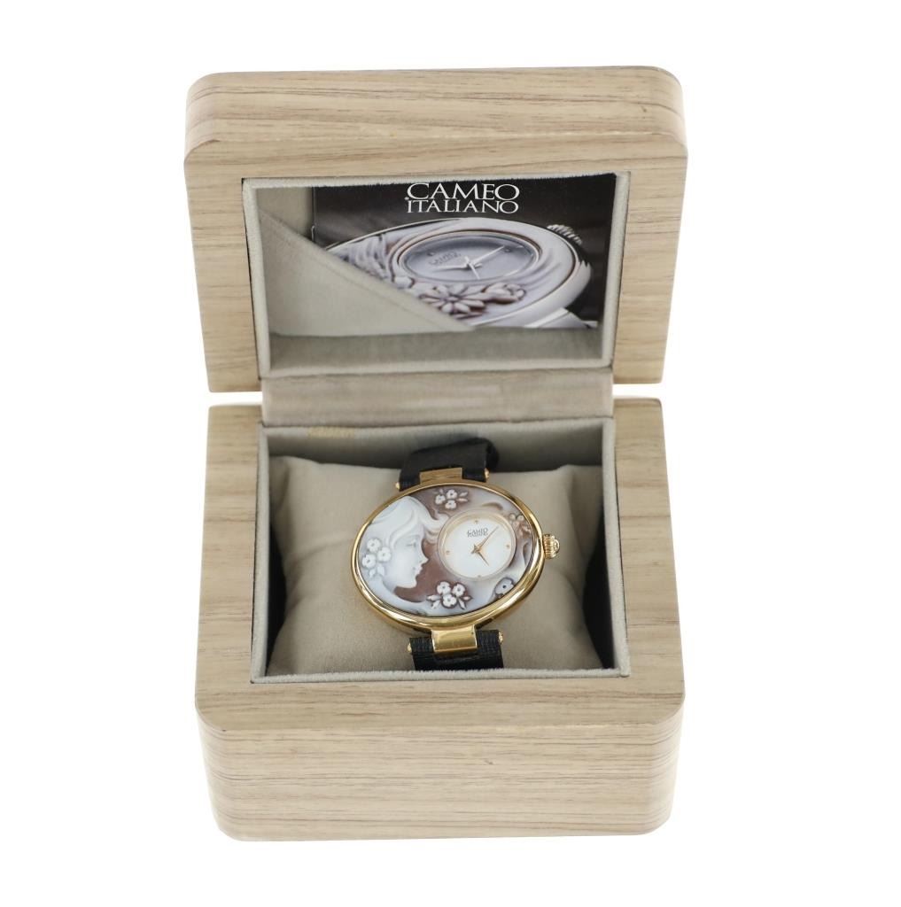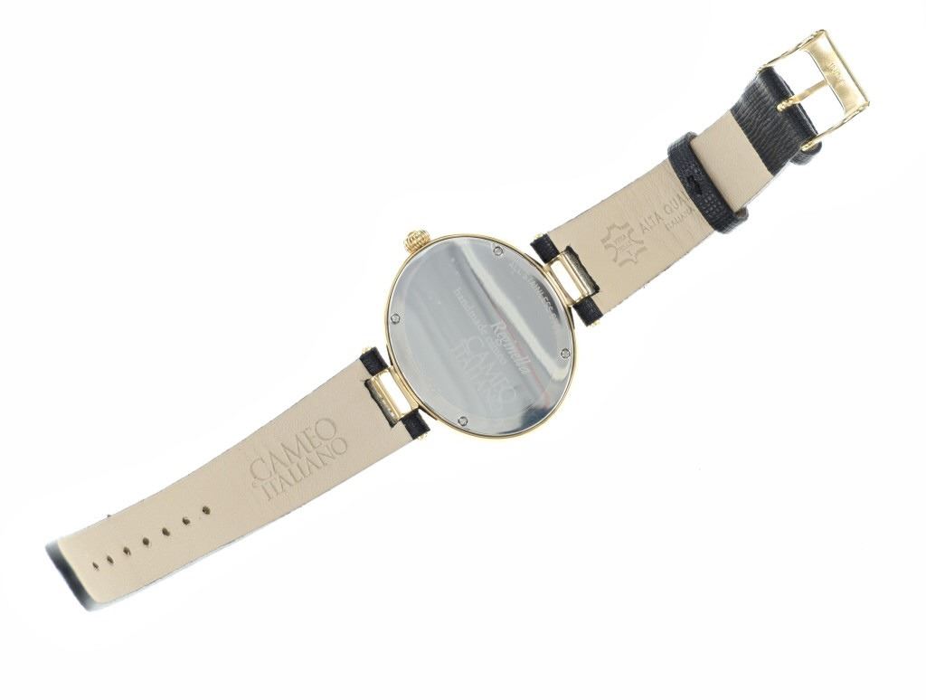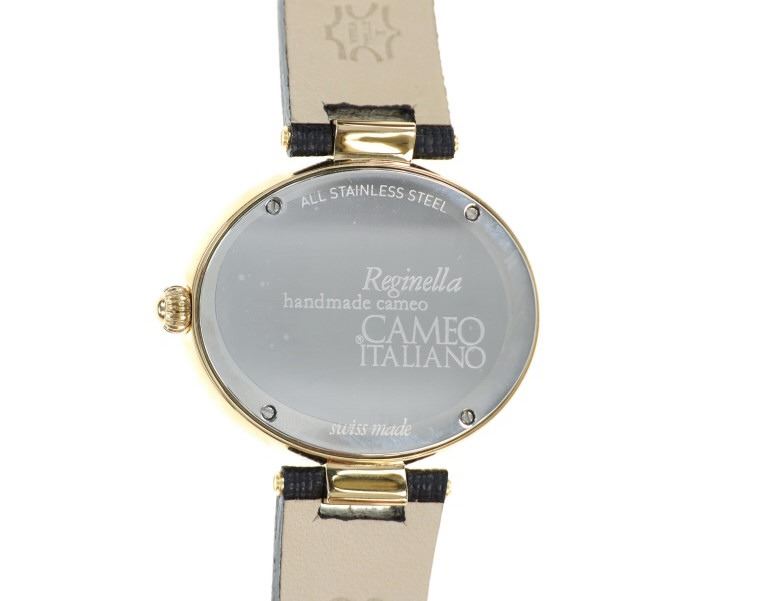 Featured in this lot is a Reginella Cameo Italiano handmade Swiss watch. The watch features a wonderfully and professionally crafted stainless steel. It is a handmade Swiss watch that shows a woman cameo with floral decoration, and it shows a leather watch band. The watch is marked as follows: Cameo Italiano - Swiss Made - All Stainless Steel - Reginella handmade cameo - Cameo Italiano - Swiss Made. The condition of this cameo watch is good with no obvious signs of damage and shows good overall condition. The measurements of this watch laid out are 9 1/4" x 1 7/8".*