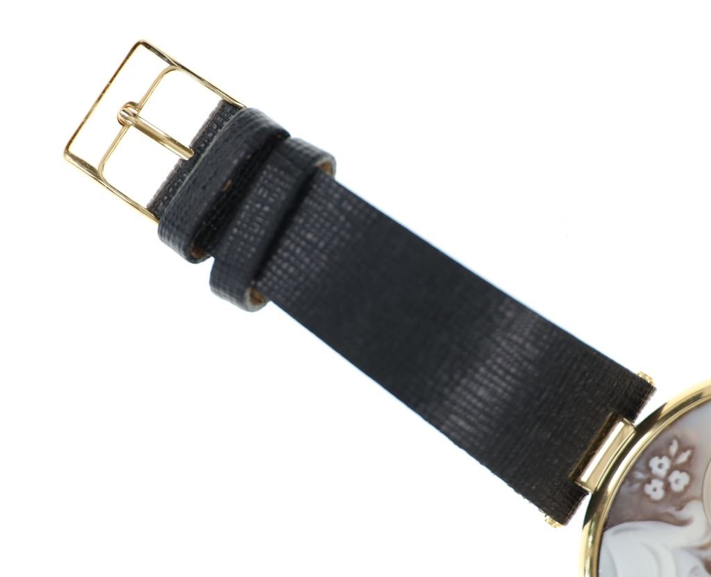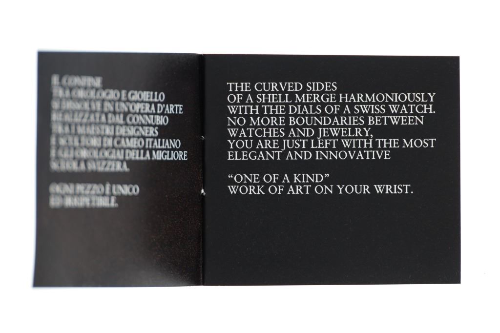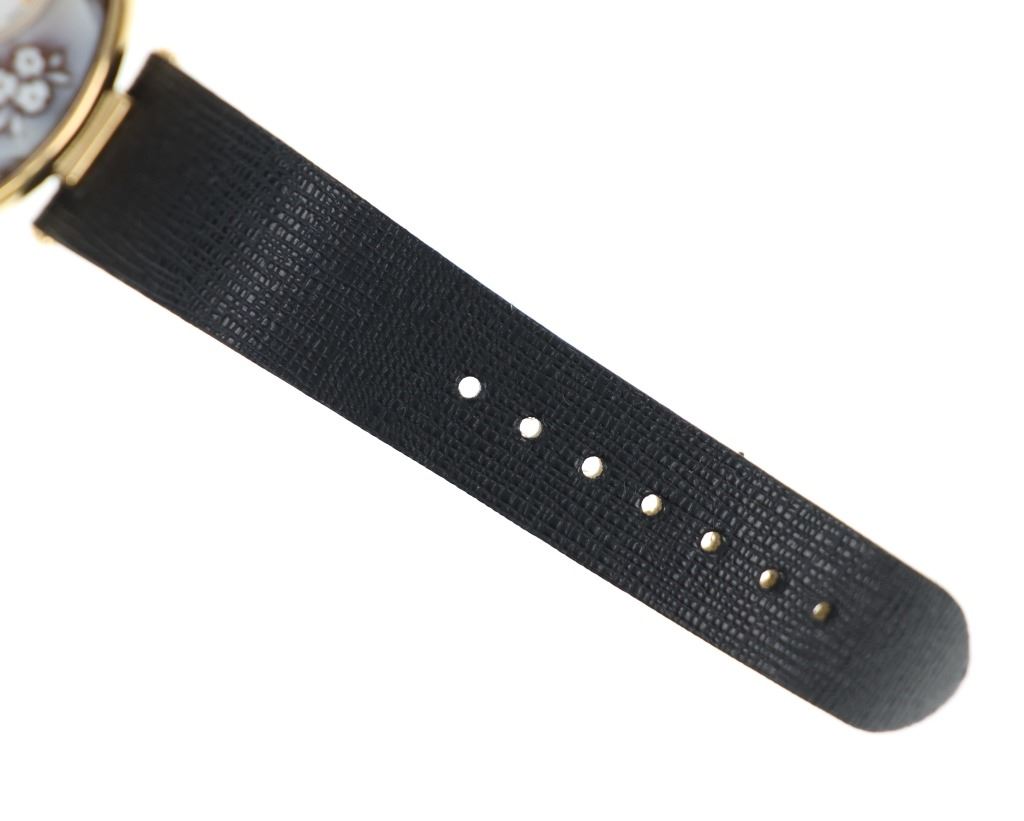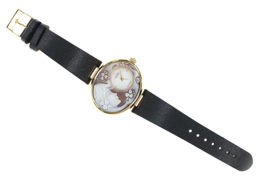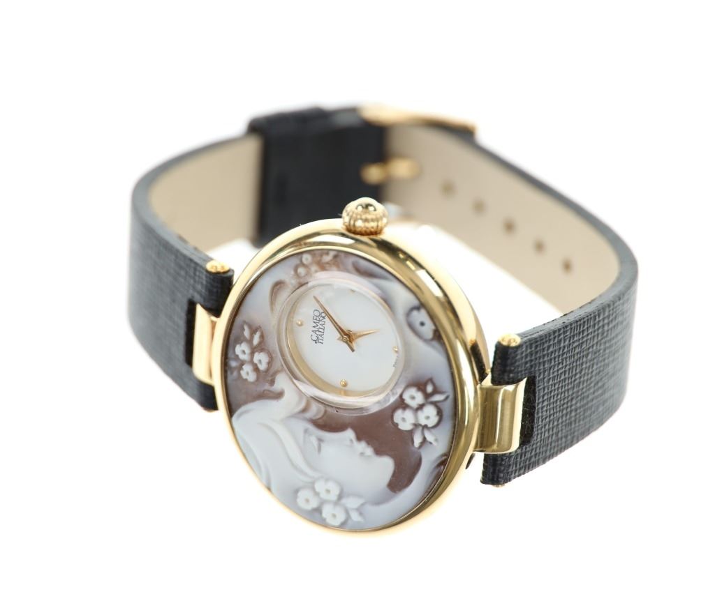 Featured in this lot is a Reginella Cameo Italiano handmade Swiss watch. The watch features a wonderfully and professionally crafted stainless steel. It is a handmade Swiss watch that shows a woman cameo with floral decoration, and it shows a leather watch band. The watch is marked as follows: Cameo Italiano - Swiss Made - All Stainless Steel - Reginella handmade cameo - Cameo Italiano - Swiss Made. The condition of this cameo watch is good with no obvious signs of damage and shows good overall condition. The measurements of this watch laid out are 9 1/4" x 1 7/8".*