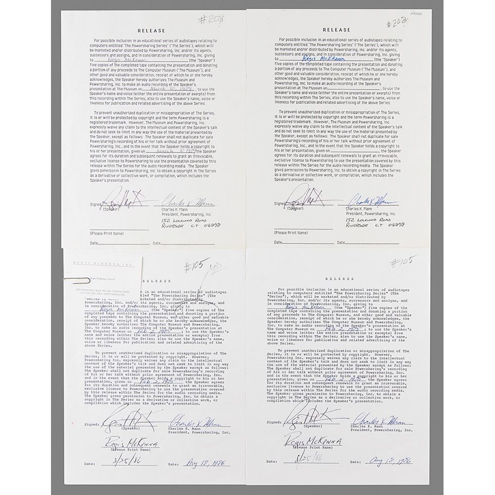 Four DSs, each one page, 8.5 x 11, dated 1986 and 1989. McKenna consents to the release of his lectures, 'Establishing Market Share in a Worldwide Economy' and 'Who's Afraid of Big Blue?,' as part of Charles Mann's "educational series of audiotapes relating to computers entitled 'The Powersharing Series.'" The earlier releases are both signed at the conclusion in black ballpoint by McKenna, printing his name and writing the date below; the later documents are signed in black felt tip by McKenna. All are countersigned in ink by Mann, who sent two copies of each release to McKenna so that he could retain one for his own files; instead, McKenna returned all of them. In overall fine condition. Accompanied by one of McKenna's personal business cards.