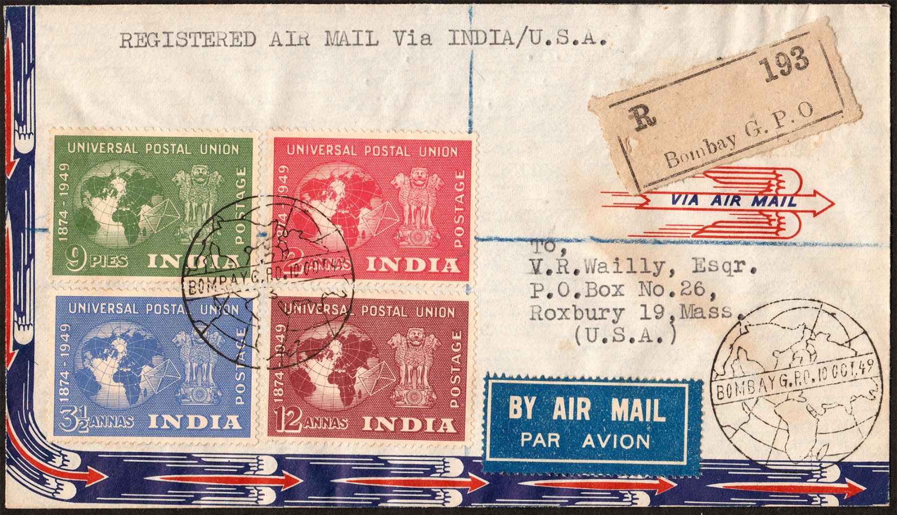 Registered Airmail Cover, 1949, complete set of stamps of value 2 Annas, 3 ½ Annas, 12 Annas and 9 Pies cancelled with a round pictorial postmark having world map and text as “BOMBAY G.P.O. 10 Oct 49”, addressed to “V.R. Wailly, Esqr. | P.O. Box No. 26, | Roxbury 19, Mass | (U.S.A.)”, Registration label affixed as “R 193 | Bombay G.P.O.”, along with marks “BY AIR MAIL | PAR AVION” and text as “REGISTERED AIR MAIL Via INDIA/U.S.A.”, a colourful pictorial articulation of “VIA AIR MAIL” with long Aero and long Wings like that of Eagle on the left and bottom edge of the cover. USA post office cancellation seals of Boston and New York on the back, dispatched by “S.R. Bhavani, | 17, Turner Road, | Bandra, Bombay – 20”, good condition.