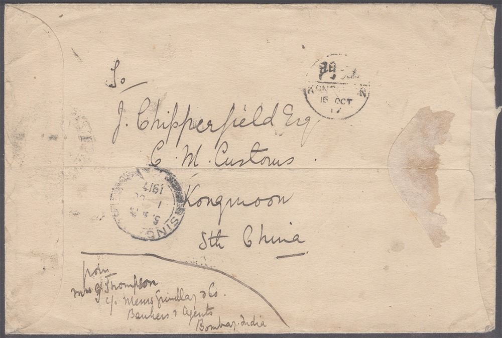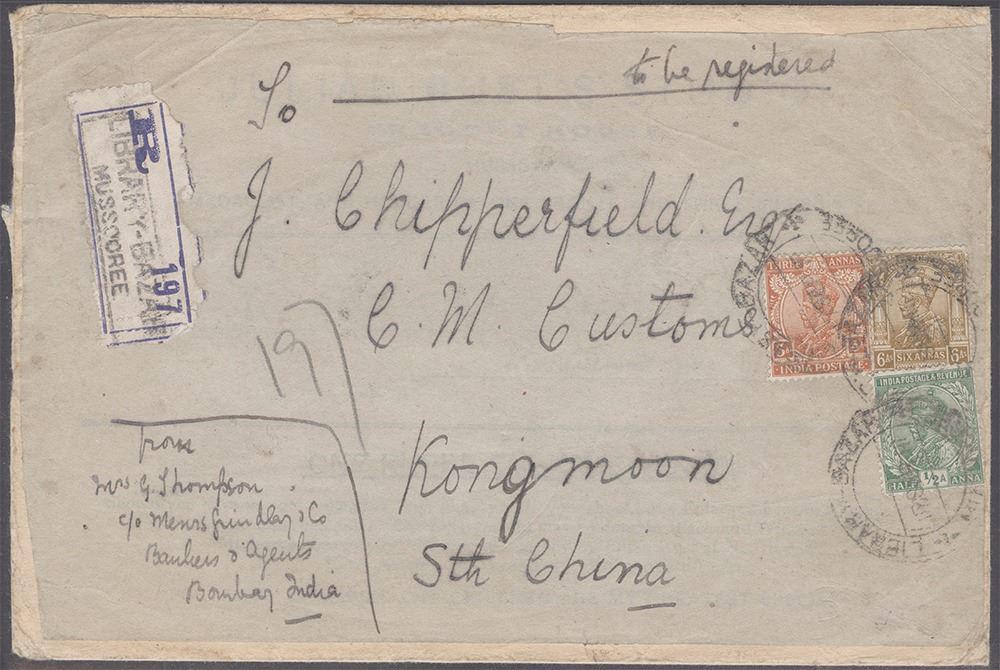 KGV, 1917, Registered Cover, Dt. 17 Sept 1917, Posted over address on the front from Library Bazzar MUSSOREE with 3 color franking of KGV annas (SG 155),3 annas(SG 172) 6annas(SG 178),Kongmoon of South China, Good Condition.