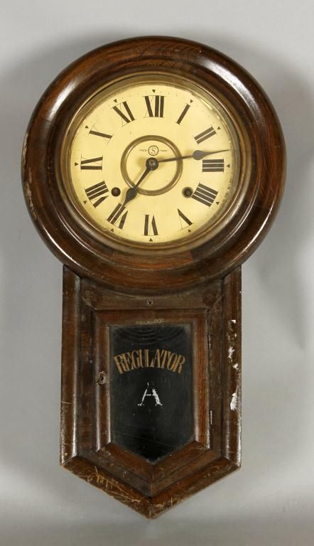 Regulator "A" Wall ClockWalnut cased, unknown working condition, measures 21"x12", condition is overall fair as the case has some holes.