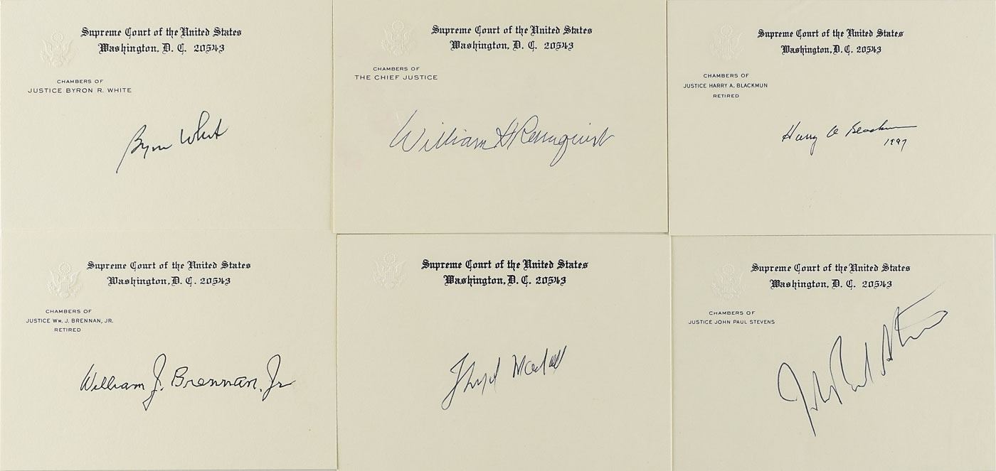 Group of six ink signatures of justices of the early Burger Court on individual 5 x 3.5 Supreme Court cards, including: William Rehnquist, Thurgood Marshall, John Paul Stevens, William J. Brennan, Harry Blackmun, and Byron White. In overall fine condition.
