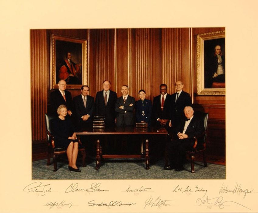 U.S. Supreme Court photograph signed by all nine members of the Rehnquist Court, most well-known for deciding the Bush v. Gore case. Bold ink signatures of Chief Justice William H. Rehnquist and Justices Antonin Scalia, John Paul Stevens, Sandra Day O'Connor, Anthony M. Kennedy, Ruth Bader Ginsburg, David H. Souter, Clarence Thomas and Stephen G. Breyer. Matted image measures 26.25'' x 23''. Near fine condition.