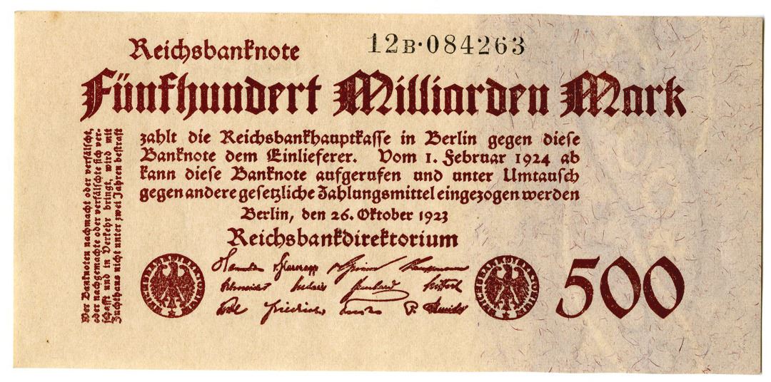 Germany. 1923. 500 Billion Mark, P-127b, Issued banknote, Dark brown on off-white, S/N 12B 084263. Fine.