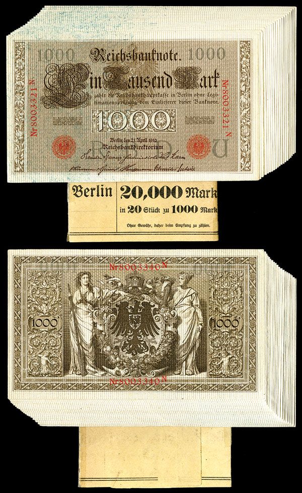 Germany, 1000 Mark, 1910, P-44b, a delightful bundle of 20 consecutive issued banknotes, with serial numbers from 8003321 to 8003340, in original bank wrapper, all UNC.
