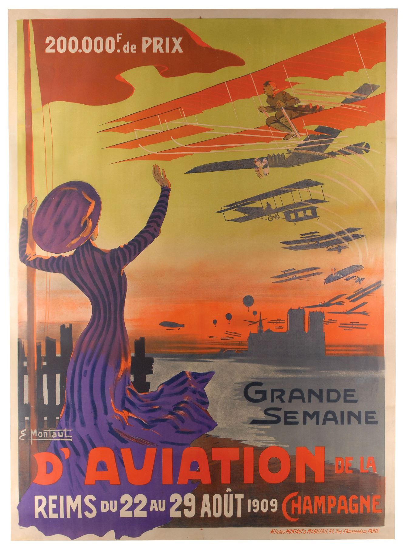 Original color poster for the first international air meet, the Grand Semaine d'Aviation, 63 x 46, held in August of 1909. Designed by Ernest Montaut, whose name is printed in the lower left, the poster depicts an exciting scene of a woman in a purple dress waving to an aviator flying overhead at an impressive speed, with silhouettes of other planes, balloons, and a blimp flying in the background. Poster has been linen backed and is in fine condition with previous storage folds. Rolled.