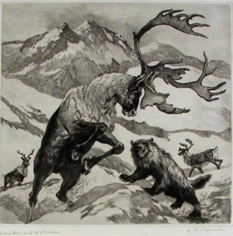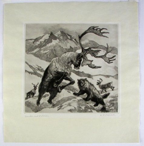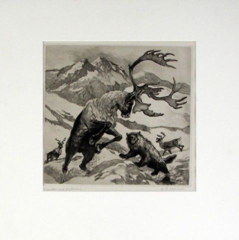 Reinhold H. Palenske, Etching , (5619) Reinhold H. Palenske (1884-1954) (IL & CA), Etching, "Caribou and Wolverine", 1945, Image Size 9 3/4" x 9 3/4", Pencil Signed