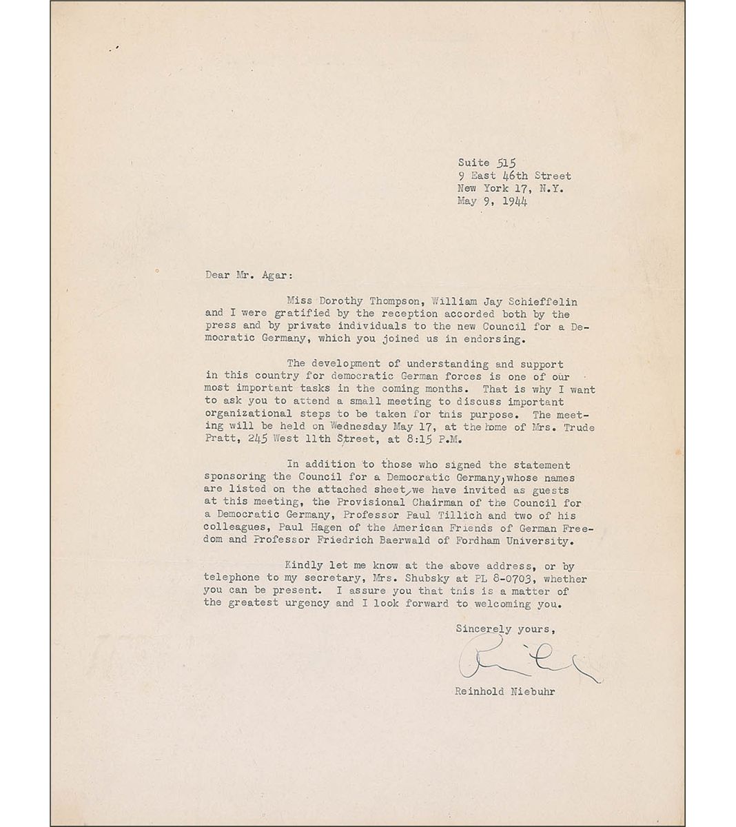Influential Protestant theologian (1892–1971) and philosopher who reshaped much of American thought concerning society, politics, and the meaning of history. TLS, one page, 8.5 x 11, May 9, 1944. In part: “Dorothy Thompson, William Jay Schieffelin and I were gratified by the reception accorded…to the new Council for a Democratic Germany…The development of understanding and support in this country for democratic German forces is one of our most important tasks in the coming months…I want to ask you to attend a small meeting to discuss important organizational steps.” Scattered wrinkling and light toning, otherwise fine condition.